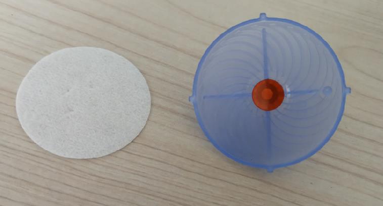 本項目共完成6個(gè)零件的自動(dòng)裝配,其中有2個(gè)注塑件上傘蓋下傘蓋,一PVC片直徑11.5mm厚0.9mm名稱(chēng)分流片,一直徑40mm無(wú)紡布片名稱(chēng)濕化體,一段導水殼一段導水芯。自動(dòng)裝配過(guò)程:轉盤(pán)式多工位方式,涉及到兩個(gè)塑料料扣合,導水芯導水殼插裝,濕化體模切后自動(dòng)就位。